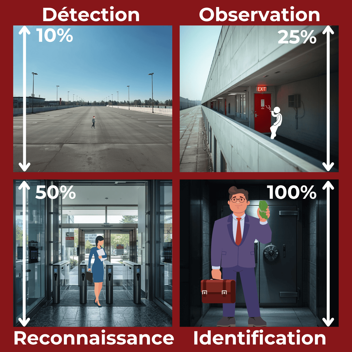 - Identification : C'est le niveau le plus exigeant et celui qui a le plus de valeur sur le plan légal. L'objectif est de capturer une image d'une qualité telle qu'elle permette d'identifier formellement un individu inconnu, au-delà de tout doute raisonnable. Ces images sont celles qui serviront de preuve irréfutable lors d'une enquête.